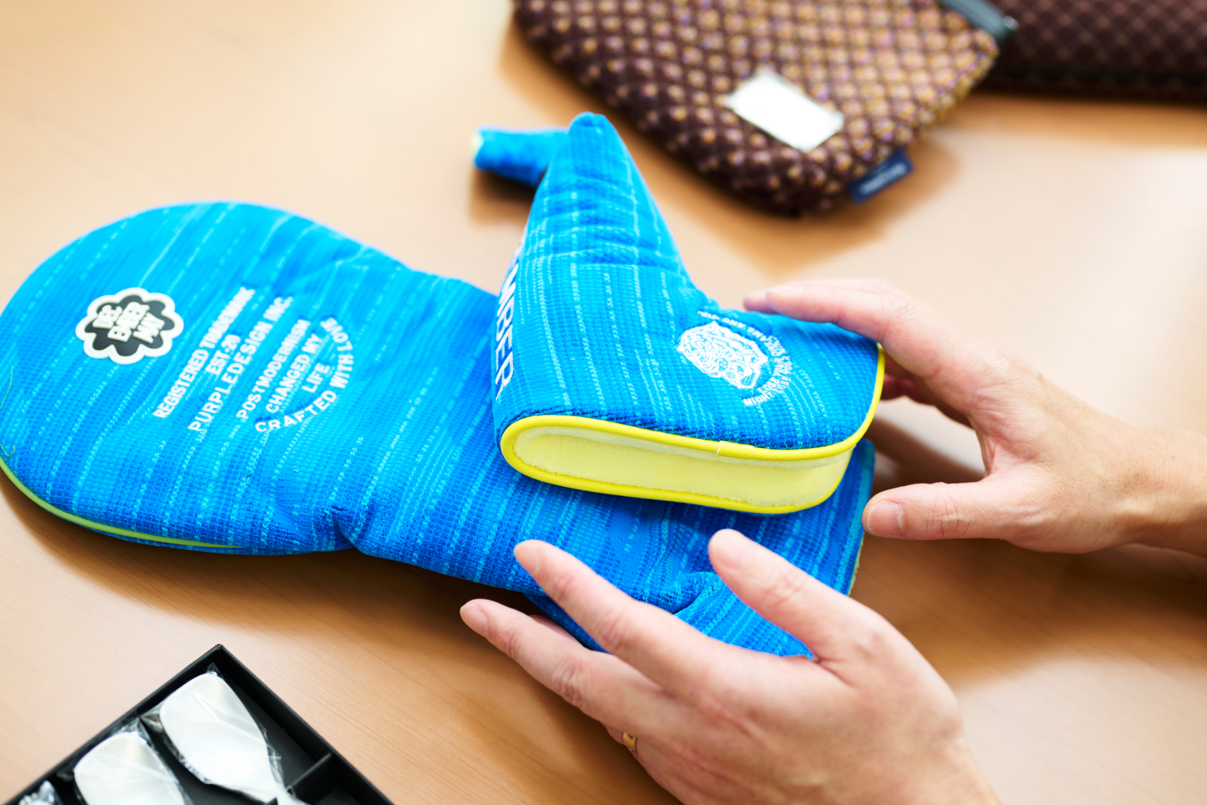 東海道新幹線の車両に使用されている素材をいかに商品に昇華させるのか。私の答えは、まったく異なる分野のブランドと掛け合わせ、その意外性を追求することでした。まずはゴルフブランド「DECEMBERMAY」とのタイアップ。東海道新幹線最新車両N700Sの普通車座席のモケット(生地)を使用してゴルフクラブのヘッドカバーを開発しました。明るい青の映えるデザインの耐久性に優れた良質な商品ができあがりました。私たちの挑戦の第一歩、少し形が見えてきました。